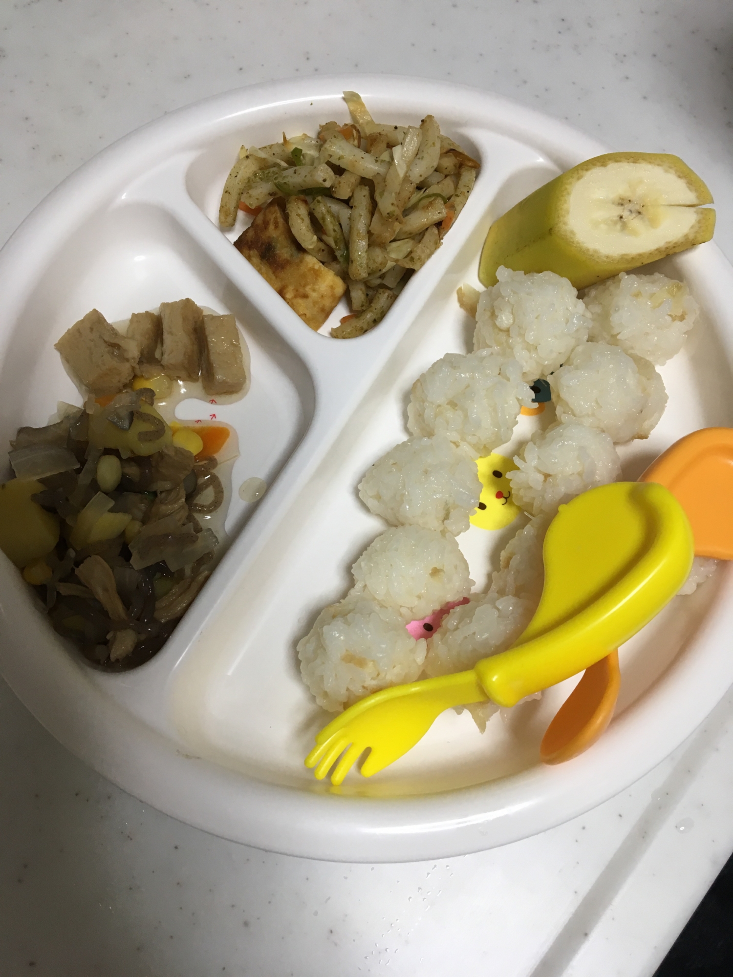 1y0m2d 離乳食完了期 鮭おにぎり 豆腐鶏ハンバーグ あんかけ マカロニ 見習い管理栄養士のできごと